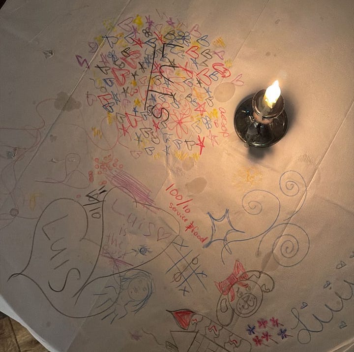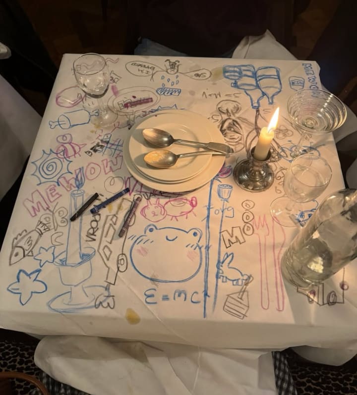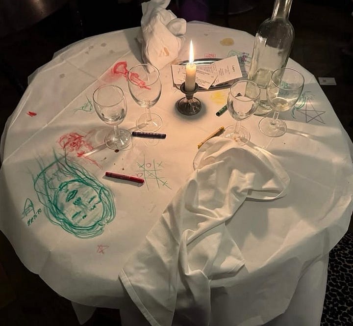 after service drawings left on the table at Lagana London, where they supply you with crayons and a fresh canvas. I plan on this at all future dinner parties